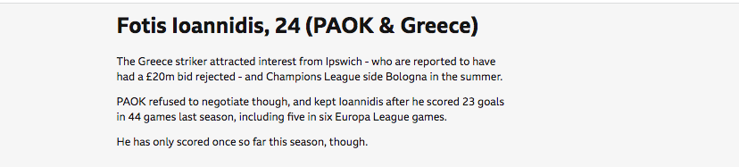 Η ιστοσελίδα σημειώνει ότι ο Έλληνας επιθετικός έχει προσελκύσει το ενδιαφέρον της Ίπσουιτς, η οποία φέρεται να προσέφερε πάνω από 20 εκατομμύρια λίρες, καθώς κι εκείνο της Μπολόνια.