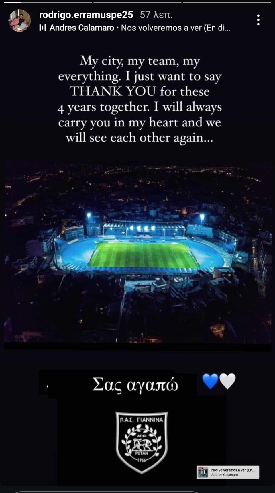 Ο Ροντρίγκο Εραμούσπε με μια ανάρτησή του στα social media αποχαιρέτησε τον ΠΑΣ Γιάννινα μετά από τέσσερα χρόνια παρουσίας.