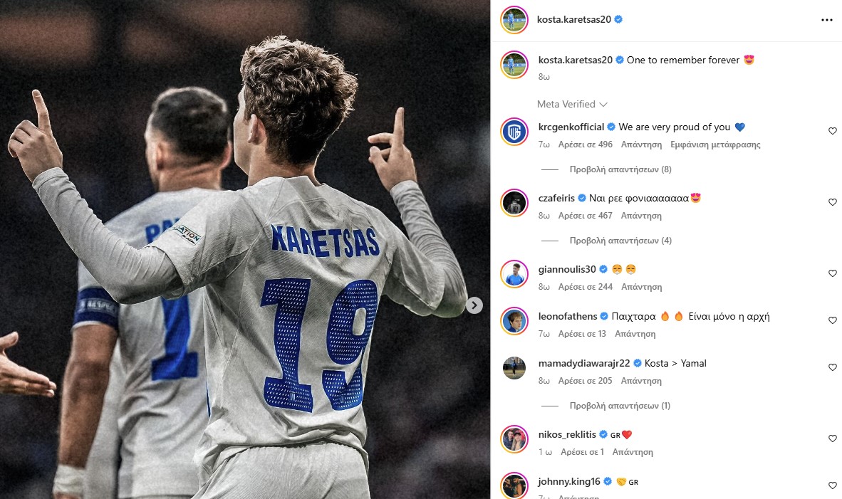 «Αλοιφή την κάνεις, σταμάτα», «Ο Μαραντόνα είναι Έλληνας», «Τι μπαλάρα ξέρεις, ρε ανίκητε», «Τι έκανες πάλι, ρε μάγε», «Κωστάρα, εύχομαι να σε δούμε στη Ρεάλ Μαδρίτης» είναι μερικά μόνο από τα αποθεωτικά σχόλια που συνοδεύουν την ανάρτησή του, αναδεικνύοντας τη δυναμική που αποκτά το νέο μεγάλο αστέρι του ελληνικού ποδοσφαίρου.