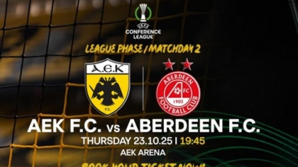 Στην κυκλοφορία τίθενται από την Παρασκευή (3/10) τα εισιτήρια του αγώνα της ΑΕΚ με την Αμπερντίν στην OPAP Arena την Πέμπτη (23/10, 19:45)