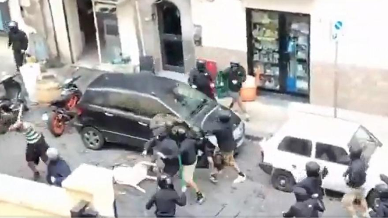 Η ατμόσφαιρα στην ιταλική πόλη μετατράπηκε σε πεδίο μάχης αρκετές ώρες πριν τη σέντρα, με τους οπαδούς των δύο ομάδων να συγκρούονται άγρια στους δρόμους και τα στενά του κέντρου. Καρέκλες εκτοξεύονταν, μπαστούνια και γκλοπ χρησιμοποιούνταν ως «όπλα», ενώ δεν έλειψαν και οι μάχες σώμα με σώμα, δίνοντας την εικόνα ανεξέλεγκτης βίας.