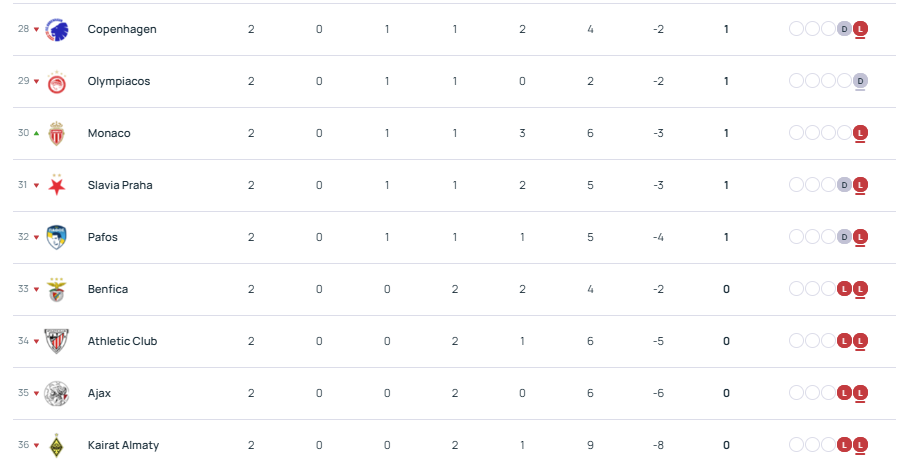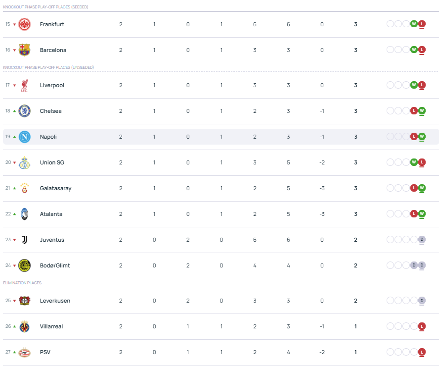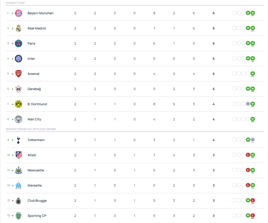 Στην κορυφή αυτής με το απόλυτο είναι Μπάγερν, Ρεάλ, Παρί, Άρσεναλ, Ίντερ και Καραμπάγκ. Ενώ, μπροστά από τον Ολυμπιακό στους 2 βαθμούς είναι οι Μπάγερ Λεβερκούζεν, Μπόντο/Γκλιμτ και Γιουβέντους.