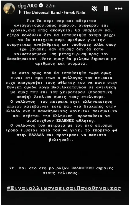 «Ο σύλλογος του Πειραιά με τον πιο επίσημο τρόπο τίθεται κατά του να γίνει το επόμενο Final Four στην Ελλάδα και προτιμά το Βελιγράδι αναφέρει μεταξύ άλλων ο ισχυρός άνδρας της ΚΑΕ, ενώ επίσης επισημαίνει και τη στάση των «πρασίνων» στην Εθνική Ελλάδας.