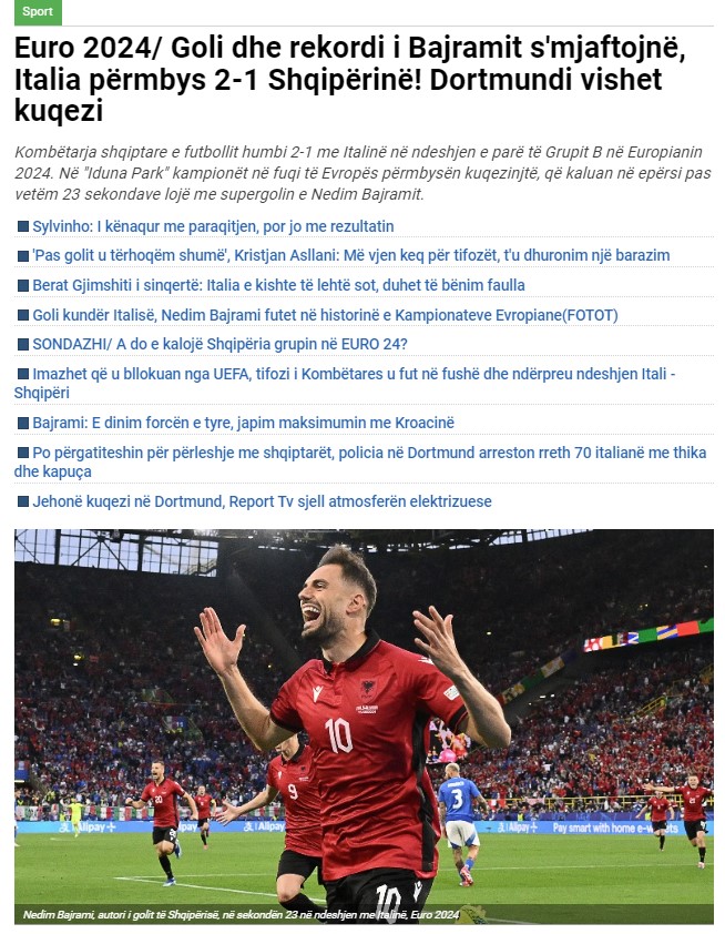 shqiptarja.com: «Το γκολ του Μπαϊράμι και το ρεκόρ δεν ήταν αρκετα, η Ιταλία νίκησε με 2-1 την Αλβανία! Το Ντόρτμονυτ ντύθηκε στα μαυροκόκκινα».