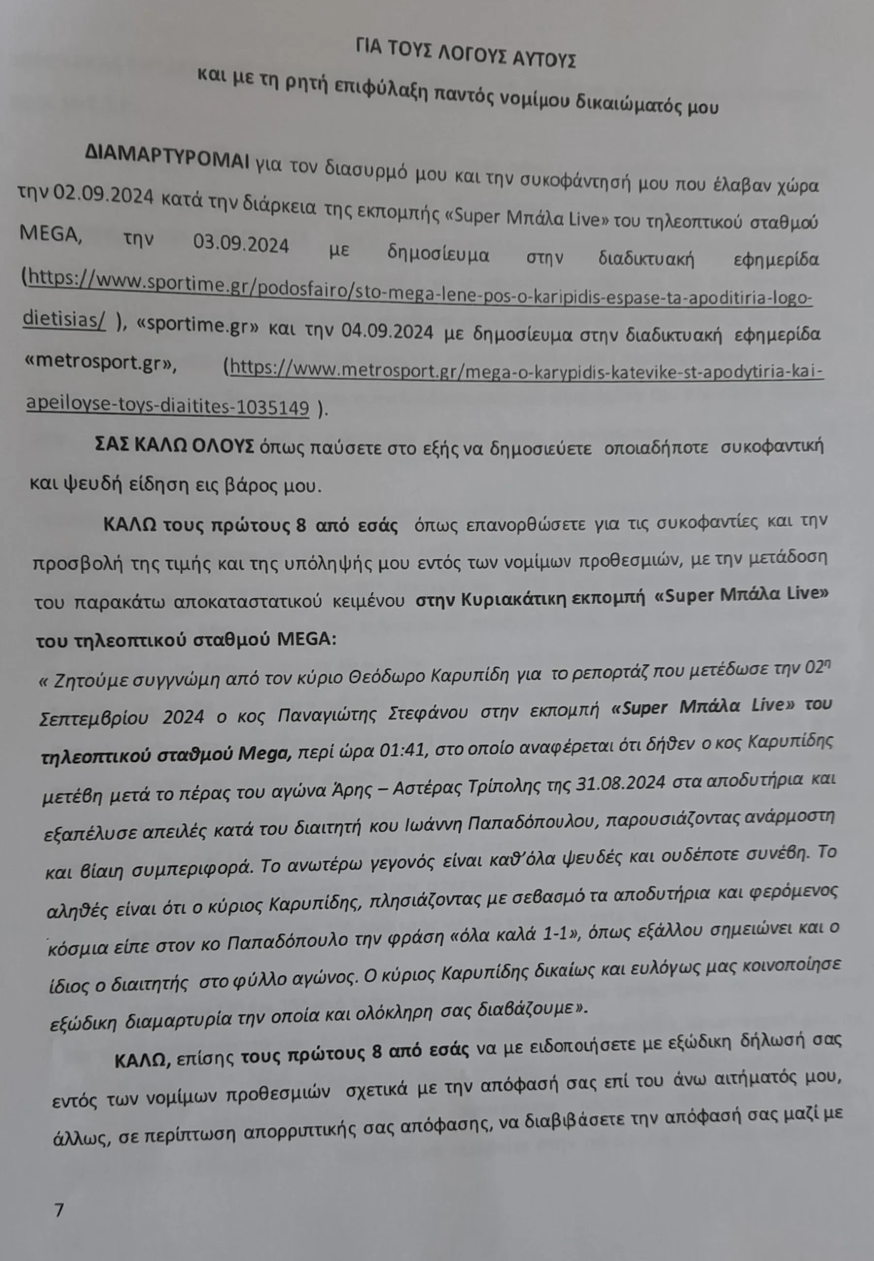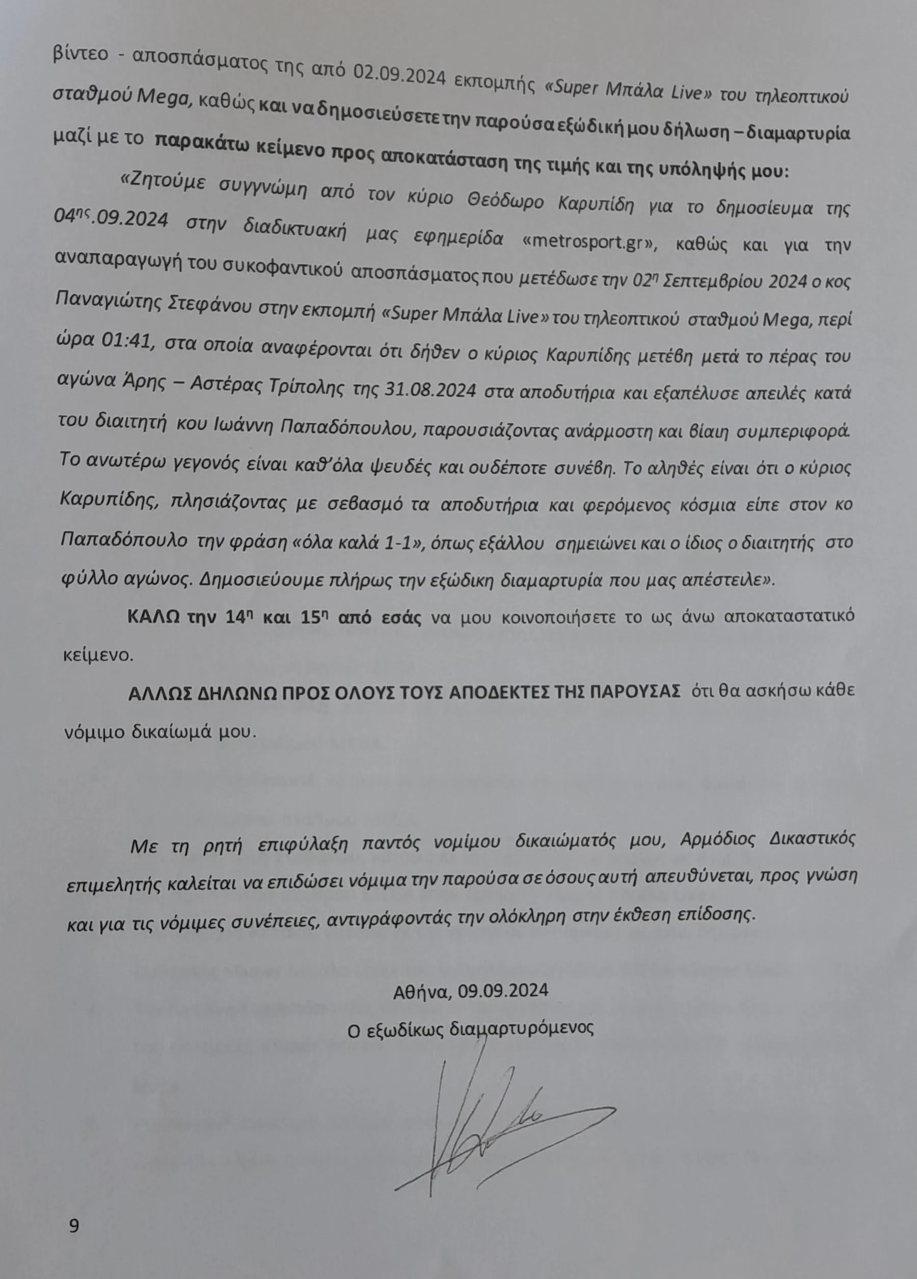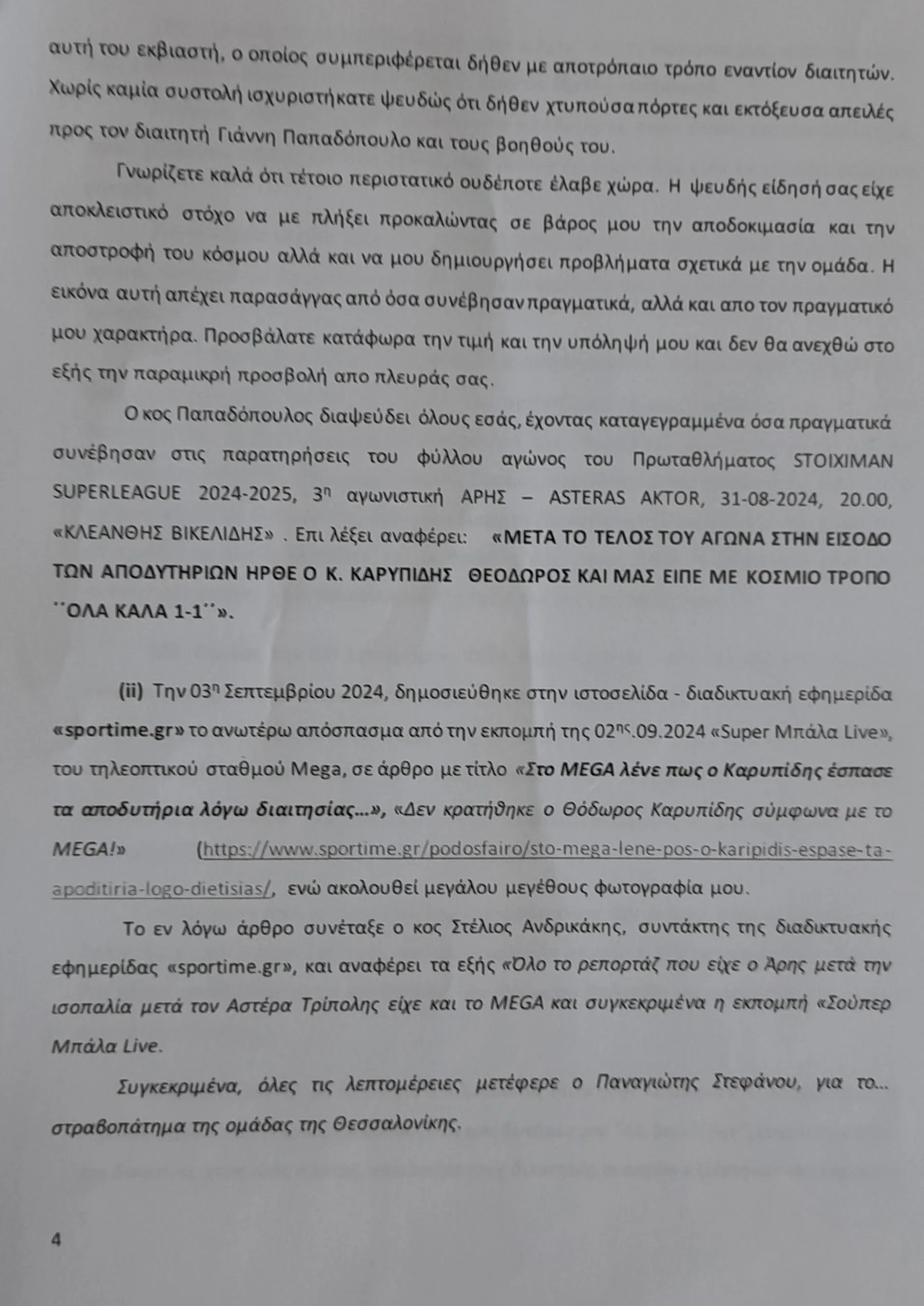Ο Θόδωρος Καρυπίδης απέστειλε εξώδικο για ρεπορτάζ του τηλεοπτικού σταθμού Mega που αναπαράχθηκε από άλλα ΜΜΕ μετά τον αγώνα του Άρη με τον Αστέρα Aktor στο «Κλεάνθης Βικελίδης».