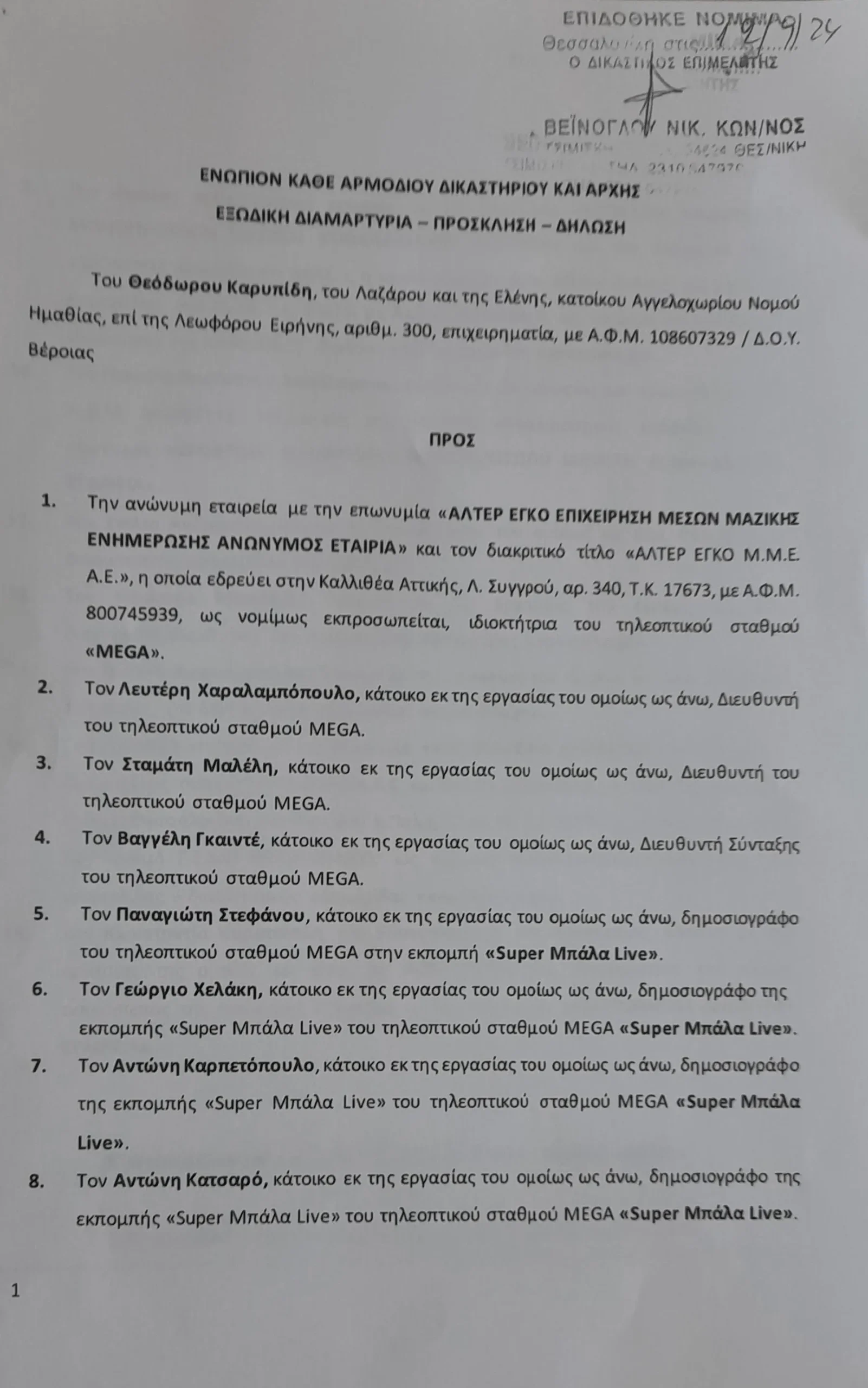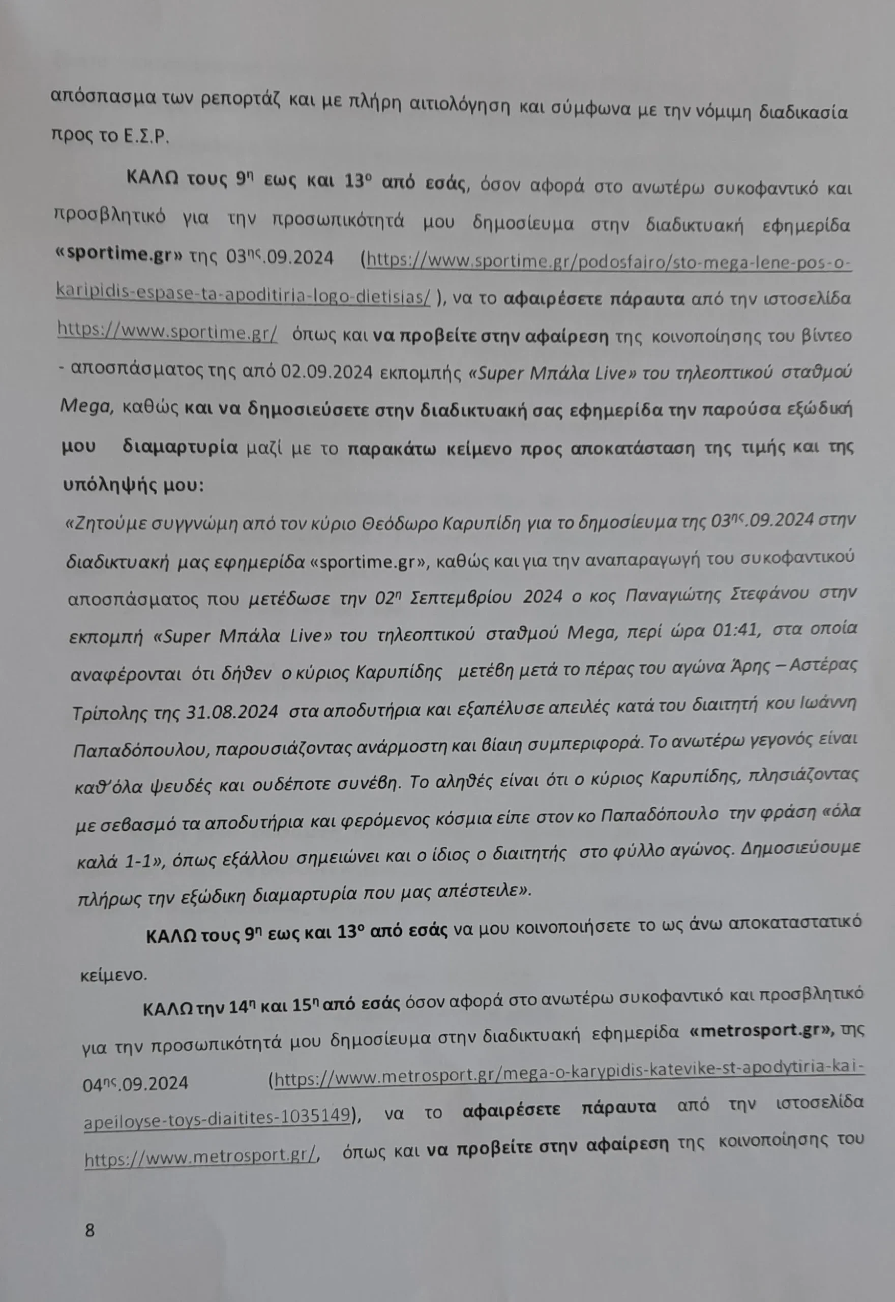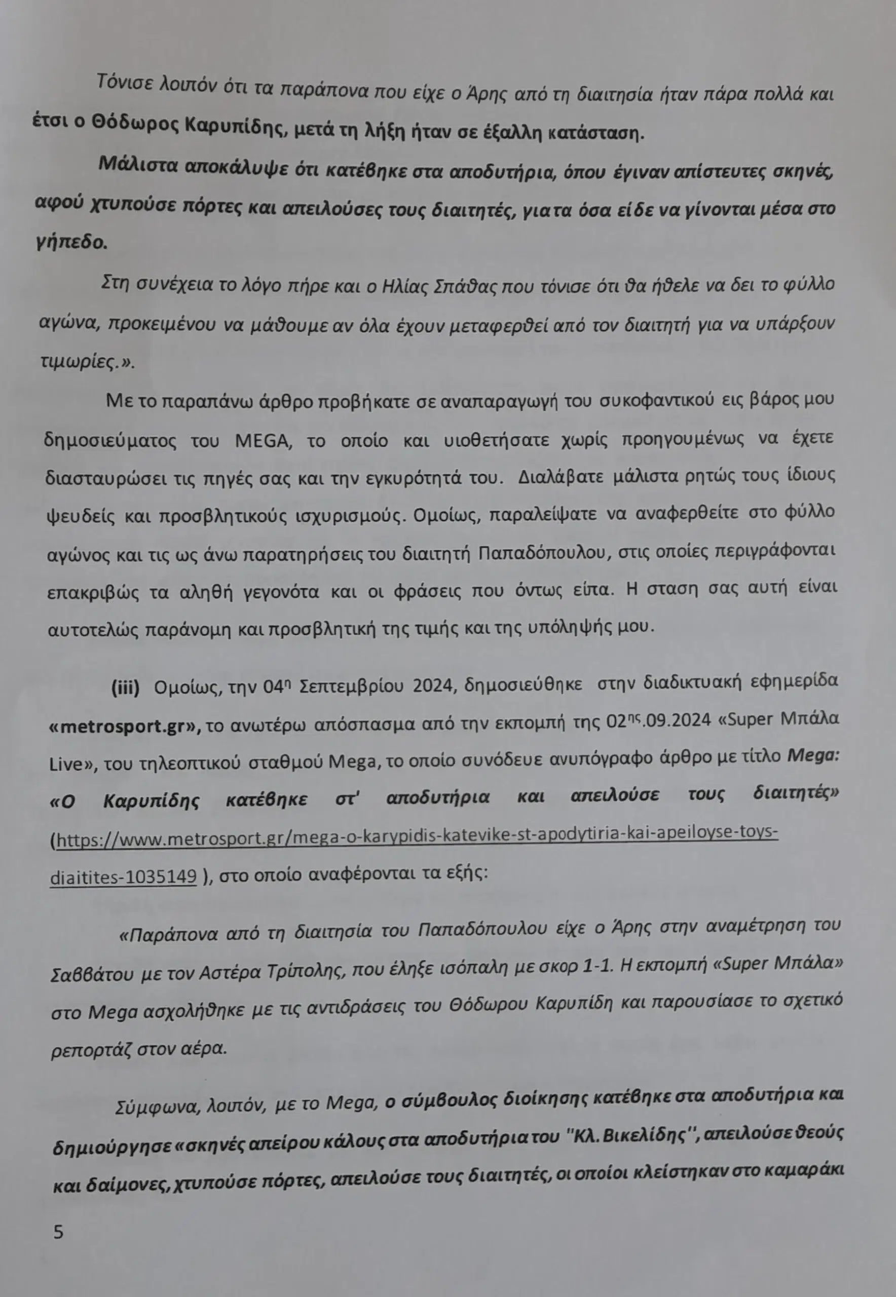 Ο Θόδωρος Καρυπίδης απέστειλε εξώδικο για ρεπορτάζ του τηλεοπτικού σταθμού Mega που αναπαράχθηκε από άλλα ΜΜΕ μετά τον αγώνα του Άρη με τον Αστέρα Aktor στο «Κλεάνθης Βικελίδης».