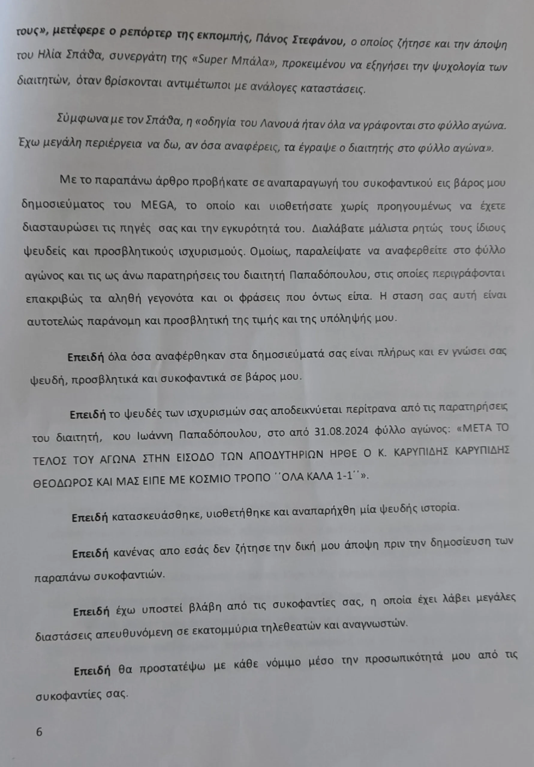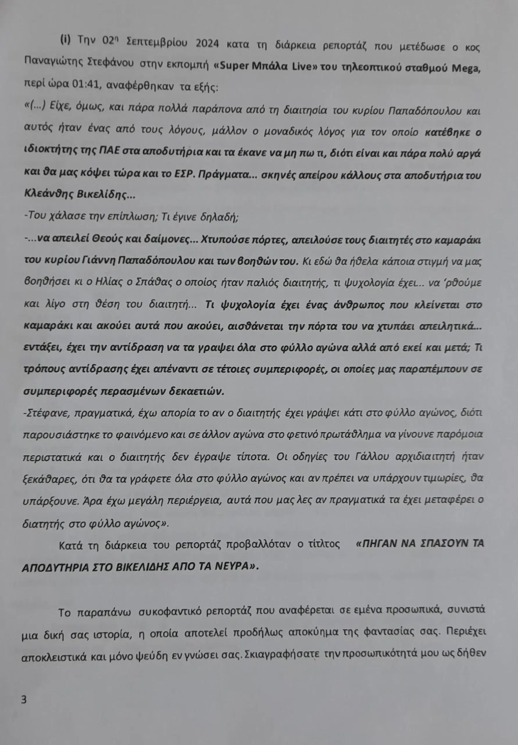 Ο ισχυρός άνδρας των «κίτρινων» με εξώδικο του σημειώνει χαρακτηριστικά όσα ειπώθηκαν στην εκπομπή του Mega περί επίθεσης στα αποδυτήρια των διαιτητών.