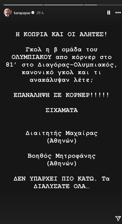Την αντίδραση του για το ακυρωθέν γκολ του Ολυμπιακού Β’ στο παιχνίδι με το Διαγόρα εξέφρασε ο Κώστας Καραπαπάς με ένα story που ανέβασε στο Instagram.