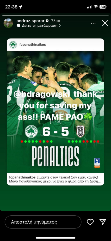 Μετά το τέλος του αγώνα ο Σπόραρ με ανάρτησή του στο Instagram ευχαρίστησε τον πορτιέρο του Παναθηναϊκού.