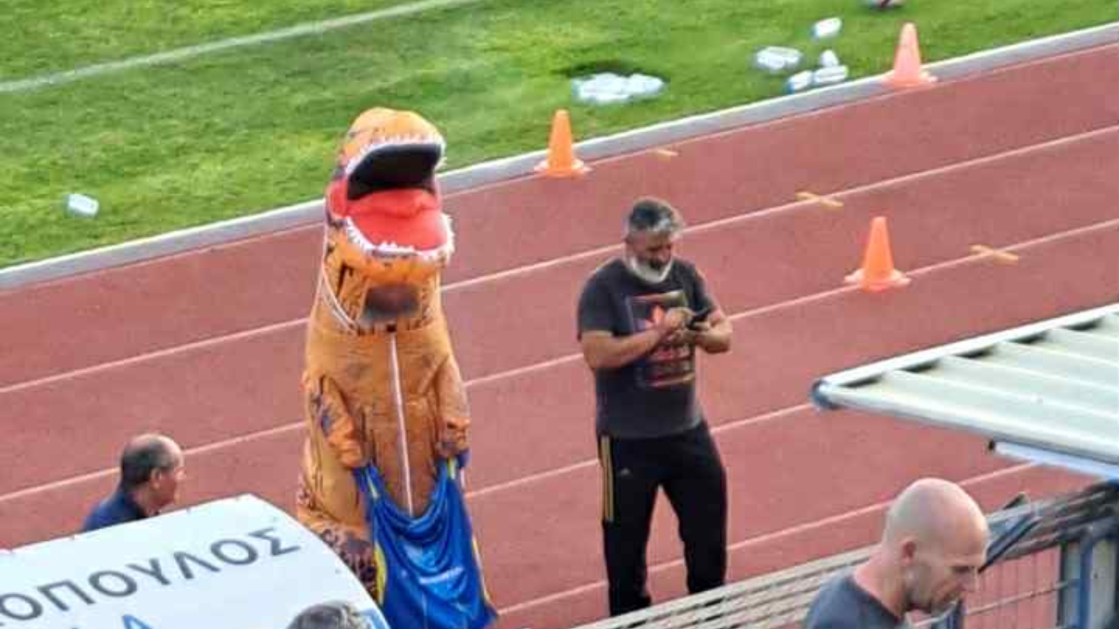 Οι νησιώτες κέρδισαν με 1-0 την Παναχαϊκή, ωστόσο η εμφάνιση ενός δεινόσαυρου στα πέριξ του αγωνιστικού χώρου προκάλεσε γέλιο και πολλές συζητήσεις στην κερκίδα. Για λίγο όσοι βρέθηκαν στον αγώνα μεταφέρθηκαν έστω και και μέσω της φαντασίας σε περιβάλλον Jurassic Park.