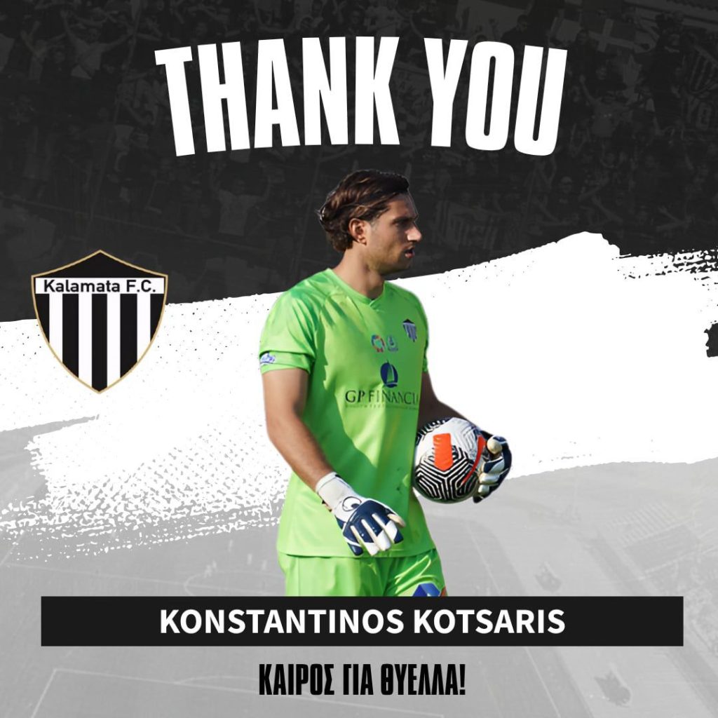 Και τυπικά παρελθόν για την Καλαμάτα αποτελεί ο Κώστας Κότσαρης, κατόπιν δικής του επιθυμίας, ώστε ο έμπειρος τερματοφύλακας «να συνεχίσει την καριέρα του σε ένα καλύτερο πρωτάθλημα», όπως τονίζει χαρακτηριστικά η «Μαύρη Θύελλα».