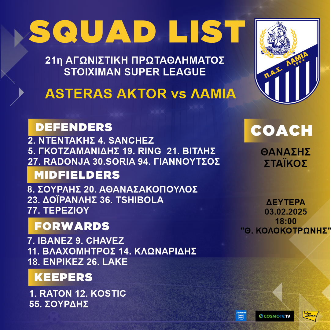 Με νέο… αέρα ετοιμάζεται να παραταχθεί η Λαμία στην αναμέτρηση με τον Αστέρα Aktor στο «Θεόδωρος Κολοκοτρώνης», καθώς η αποστολή της ομάδας περιλαμβάνει αρκετές εκπλήξεις.