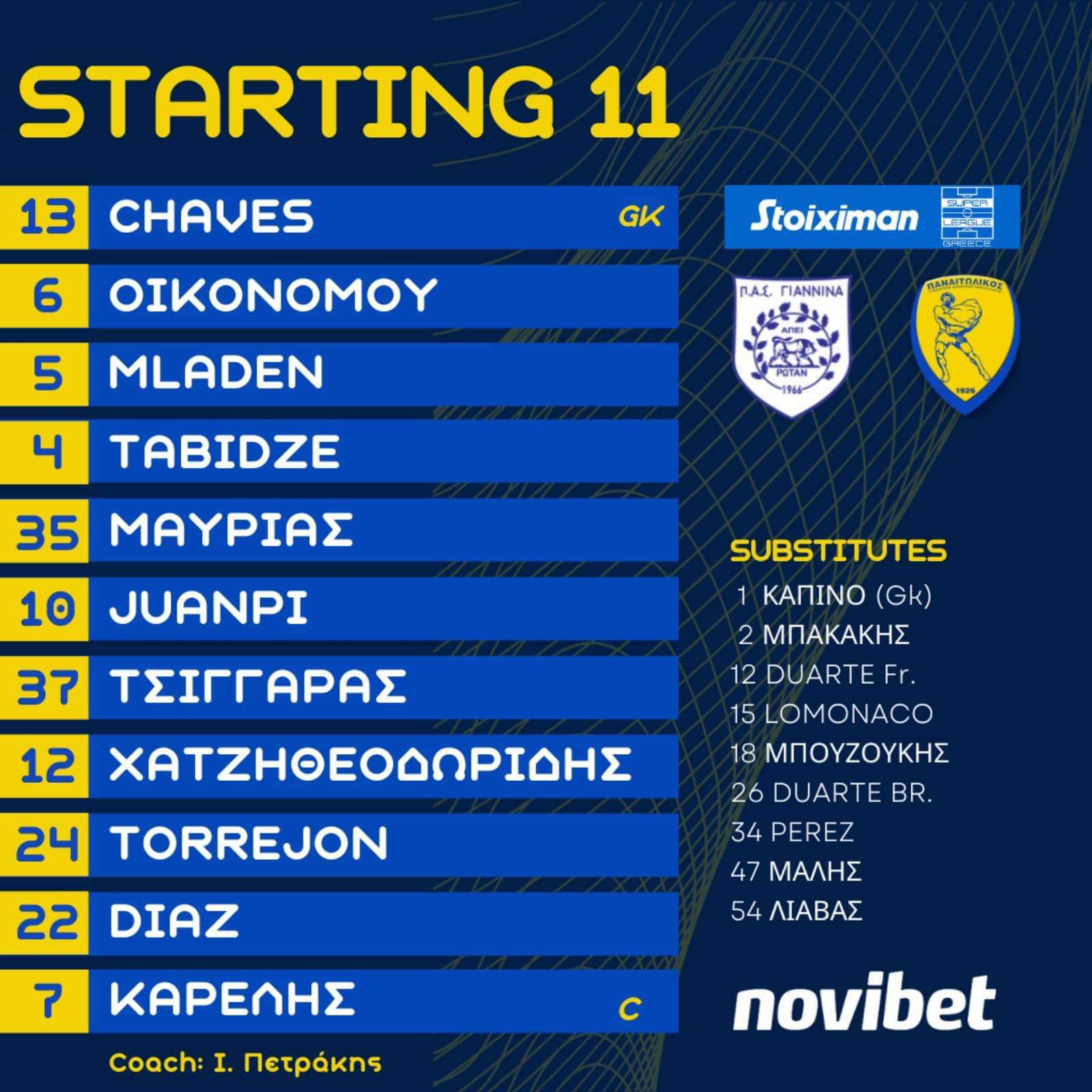 Ο προπονητής του Παναιτωλικού επέλεξε σε σύστημα 3-5-2 τον Λούκας Τσάβες κάτω από τα δοκάρια, με τους Μάριο Οικονόμου, Σεμπάστιαν Μλάντεν και Τζίμι Ταμπίτζε στην τριπλέτα των σέντερ μπακ. Ο Χάρης Μαυρίας θα αγωνίζεται στην δεξιά πλευρά με τον Πέδρο Σίλβα Τορεχόν στην αριστερή. Στον άξονα θα βρίσκονται οι Χουάνπι, Άγγελος Τσιγγάρας και Ηλίας Χατζηθεοδωρίδης, ενώ μπροστά τους θα είναι το δίδυμο Σέρχιο Ντίας, Νίκος Καρέλης.