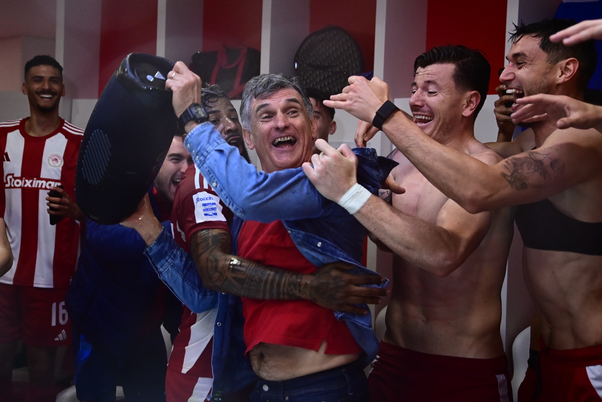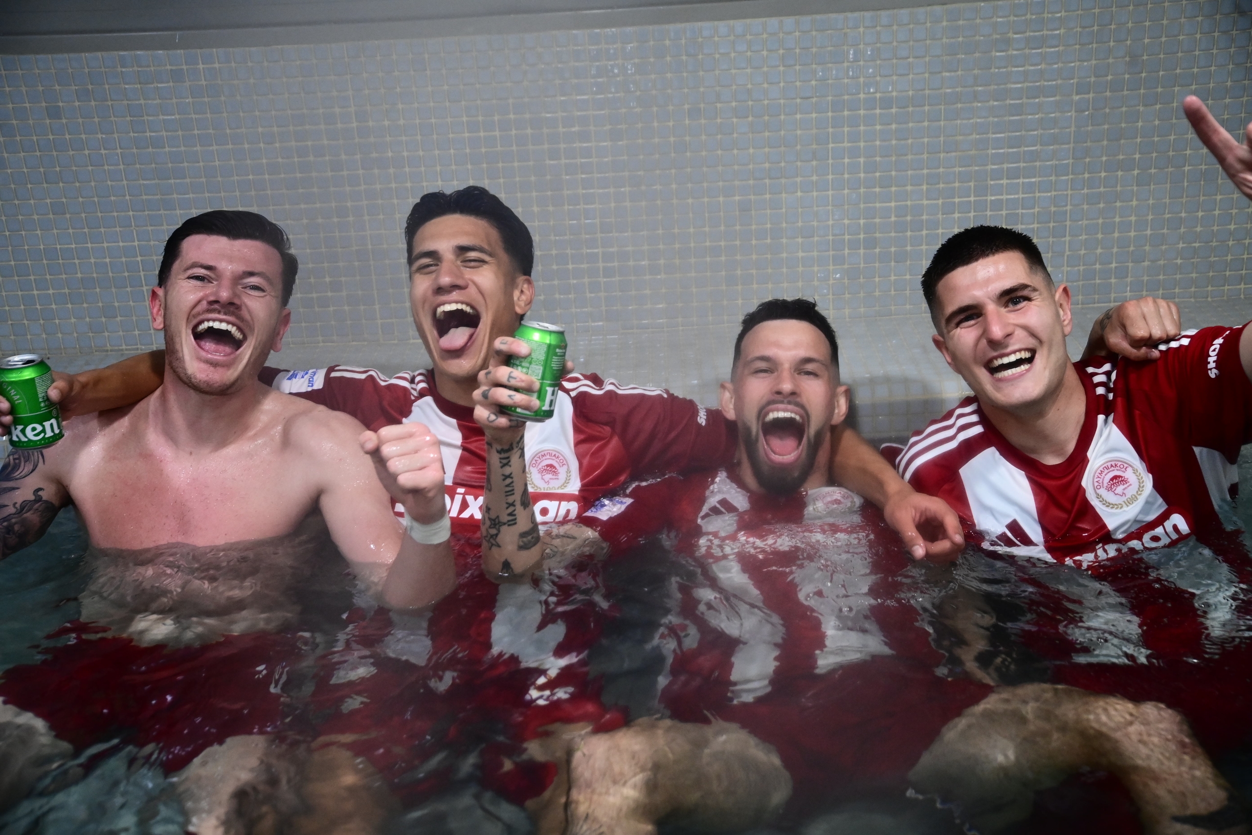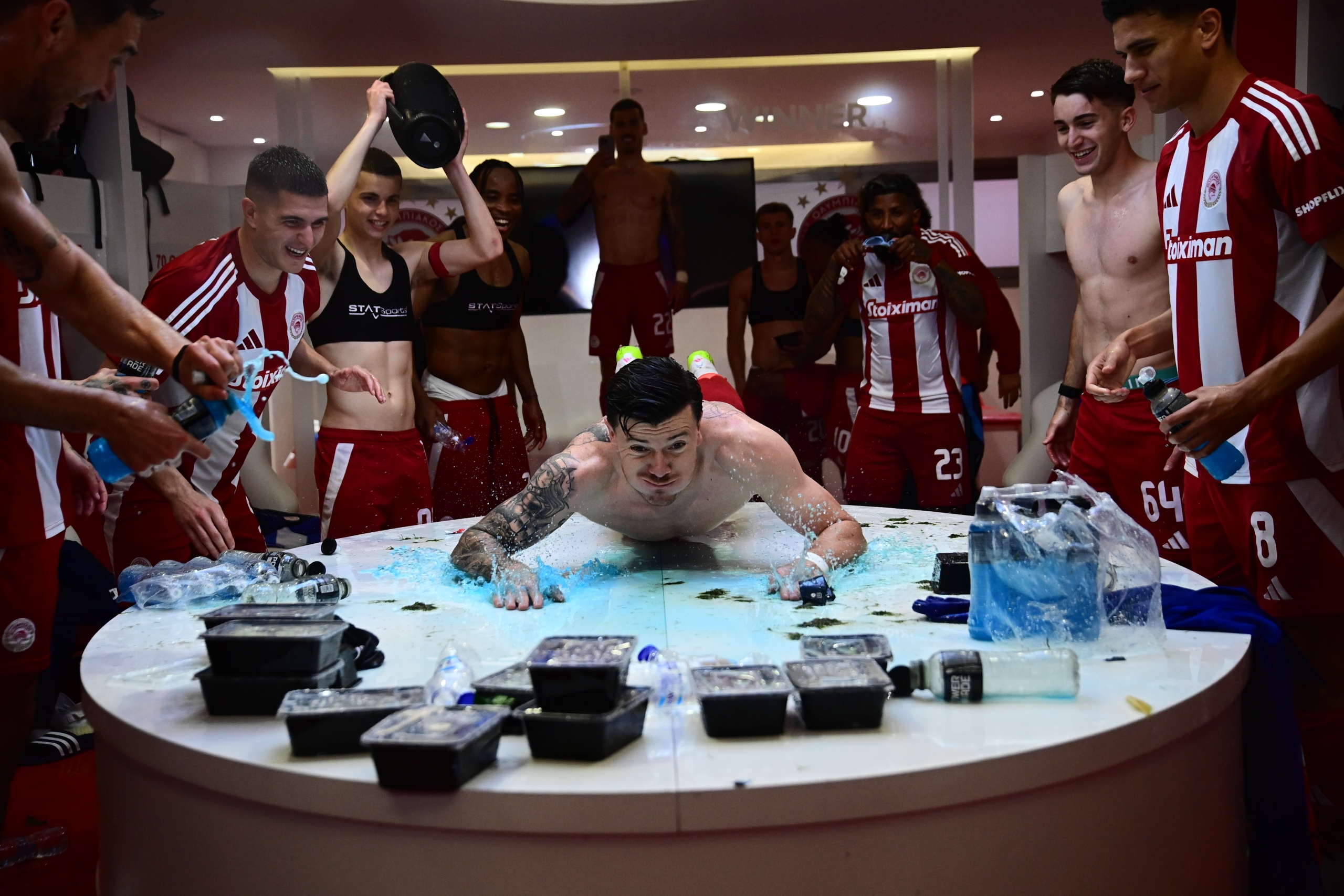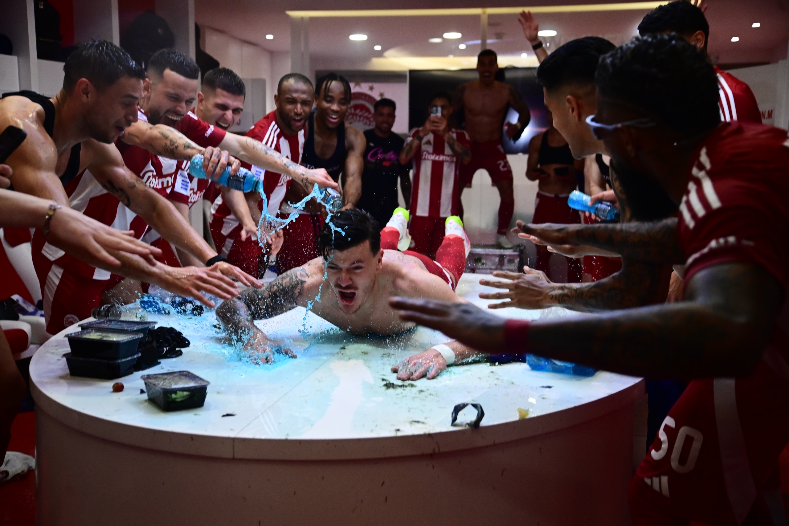 Οι «ερυθρόλευκοι» έστησαν το δικό τους πάρτι στα αποδυτήρια μετά τη λήξη του ντέρμπι με την Ένωση και πανηγύρισαν με την ψυχή τους την κατάκτηση του τίτλου.