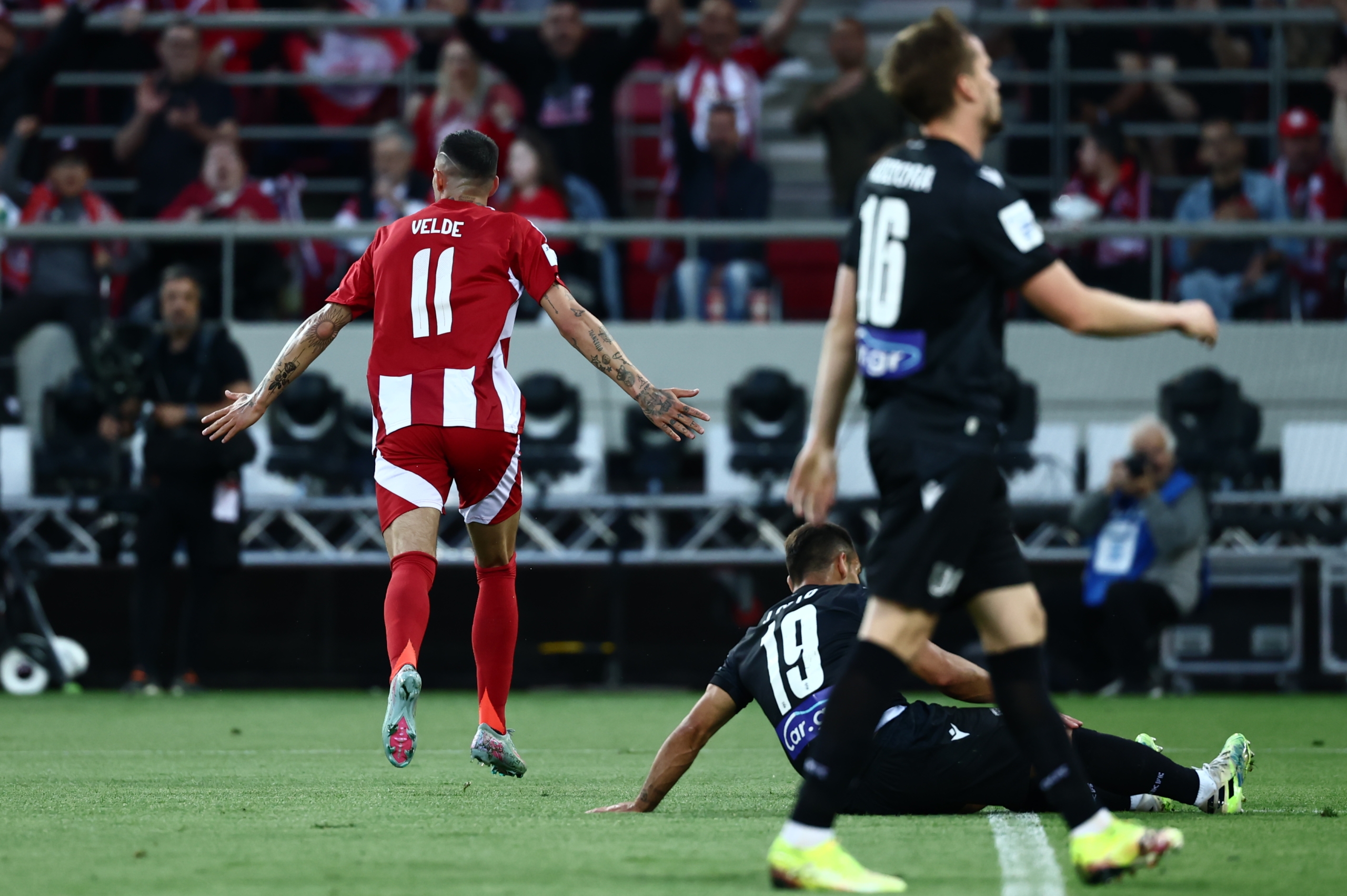 Οι «ερυθρόλευκοι» στο 14′ ισοφάρισαν το Δικέφαλο με πρωταγωνιστή τον Βέλντε. Η φάση ξεκίνησε από τον Ελ Καμπί, που πήρε τη μπάλα με πλάτη στην περιοχή και μοίρασε εξαιρετικά στον Νορβηγό.