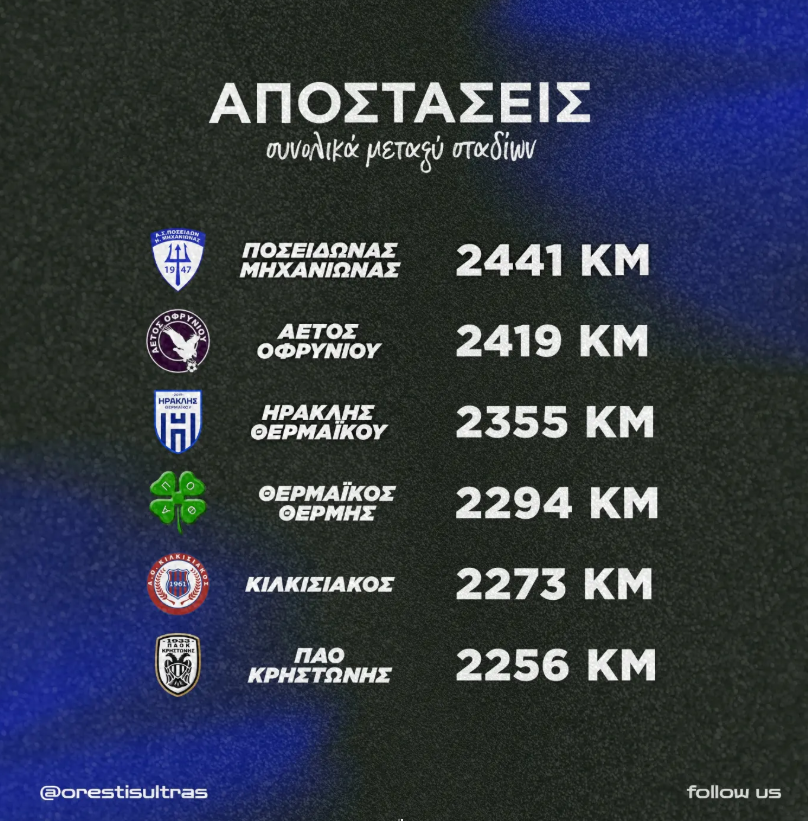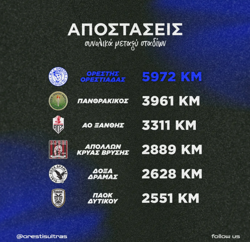 «Στο νέο γράφημα με τις αποστάσεις που διανύουν οι ομάδες του ομίλου μας στην Γ’ Εθνική, ο Ορέστης ξεχωρίζει, καθώς διανύει την μεγαλύτερη συνολική απόσταση για τις αγωνιστικές του υποχρεώσεις. Μια ακόμα απόδειξη των δυσκολιών που αντιμετωπίζει η ομάδα μας στο πρωτάθλημα».