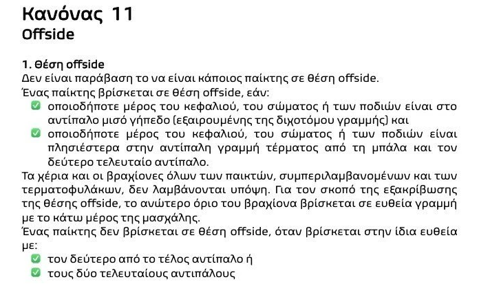 Η φάση προκάλεσε πολλές συζητήσεις, αφού στο πρώτο ριπλέι φαινόταν πως το χέρι του Τάσου Μπακασέτα κάλυπτε τον σκόρερ. Ωστόσο, ο κανονισμός είναι ξεκάθαρος: τα χέρια και οι βραχίονες δεν λαμβάνονται υπόψη για τον καθορισμό της θέσης στο οφσάιντ. Όπως ορίζεται στο άρθρο 11 των «Κανόνων του Παιχνιδιού», το όριο για τον επιθετικό ποδοσφαιριστή βρίσκεται στη μασχάλη, δηλαδή στο σημείο από το οποίο μπορεί να σκοράρει νόμιμα.