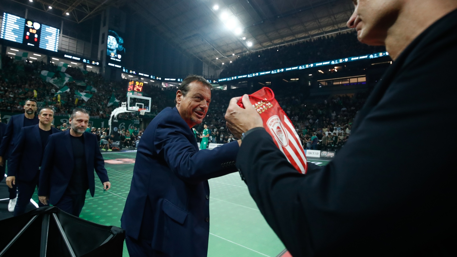 Ο Εργκίν Αταμάν αρνήθηκε να παραλάβει το λάβαρο του Ολυμπιακού, σπάζοντας την καθιερωμένη τελετουργία που τιμά την αθλητική ευγένεια. Ο Τούρκος προπονητής περιορίστηκε σε μια σύντομη χειραψία με τον Γιώργο Μπαρτζώκα, χωρίς να ανταλλάξει κουβέντες ή βλέμμα με τα υπόλοιπα μέλη του «ερυθρόλευκου» πάγκου.