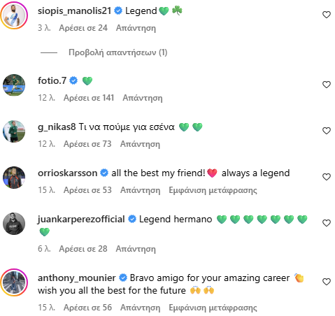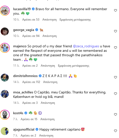 Ανάμεσά τους, παλιοί και νυν συμπαίκτες έσπευσαν να τον ευχαριστήσουν και να του εκφράσουν τον σεβασμό και την αγάπη τους για όσα πρόσφερε εντός κι εκτός γηπέδου. Ο Φώτης Ιωαννίδης, ο Δημήτρης Λημνιός, ο Γιάννης Νικάς , ο Αντονί Μουνιέ, ο Χούανκαρ, ο Βαγιαννίδης και ο Αταζαγκούν ήταν μόνο μερικοί από αυτούς που σχολίασαν κάτω από τη συγκινητική ανάρτηση του Πορτογάλου με λόγια καρδιάς.