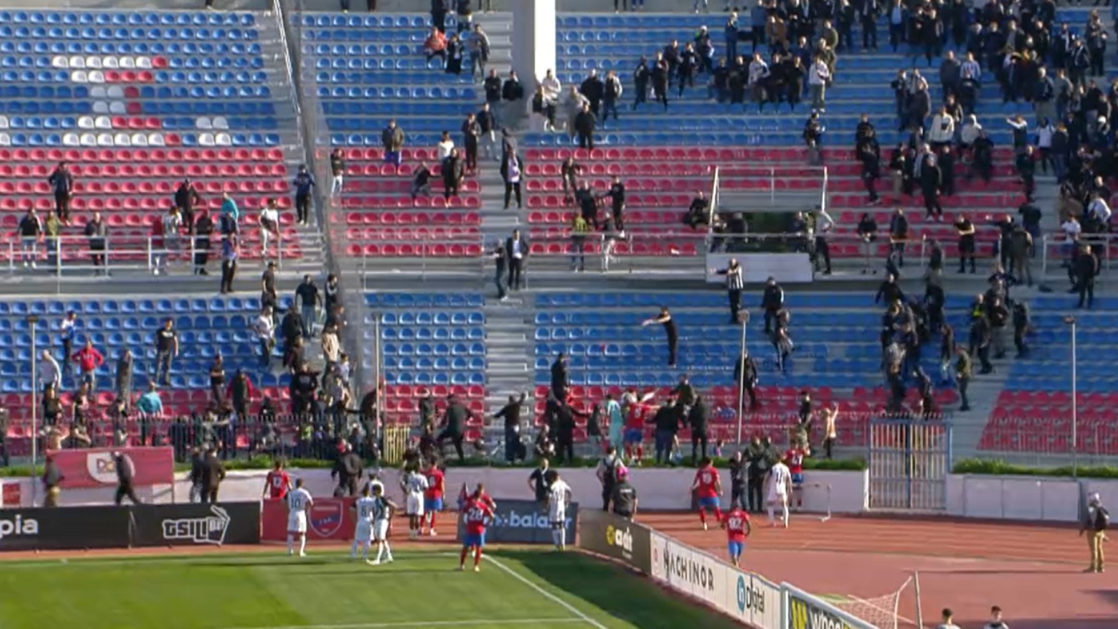 Λίγο μετά το 30΄προκλήθηκε ένταση στην εξέδρα όπου βρίσκονταν οι οπαδοί της Καλαμάτας. Φίλαθλοι του Πανωνίου κατευθύνθηκαν προς το σημείο, κατάφεραν να μπουν μέσα στον χώρο όπου βρίσκονταν οι φίλοι της Μαύρης Θύελλας, με αποτέλεσμα να προκληθεί σύρραξη ανάμεσά τους.