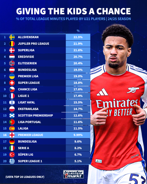 Στην πράξη, οι νεαροί ποδοσφαιριστές βλέπουν ελάχιστο χρόνο συμμετοχής σε βασικές αναμετρήσεις, ενώ οι προτιμήσεις στρέφονται σε πιο έμπειρους και ακριβούς παίκτες, όπως φαίνεται και από την έρευνα του transfermarkt.