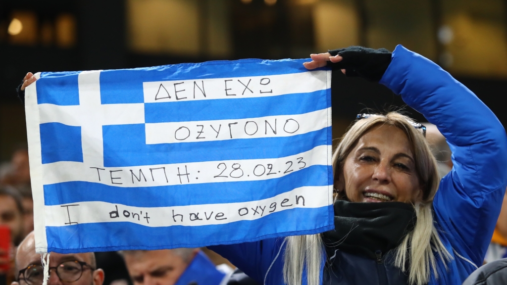 Ανάμεσά τους, μία Ελληνίδα οπαδός τράβηξε τα βλέμματα με την ελληνική σημαία που κρατούσε, στην οποία ήταν γραμμένο το μήνυμα «Δεν έχω οξυγόνο» — στα ελληνικά και στα αγγλικά — συνοδευόμενο από την ημερομηνία της τραγωδίας στα Τέμπη.
