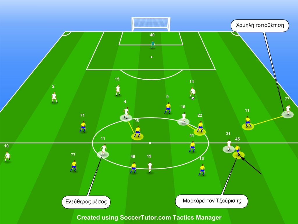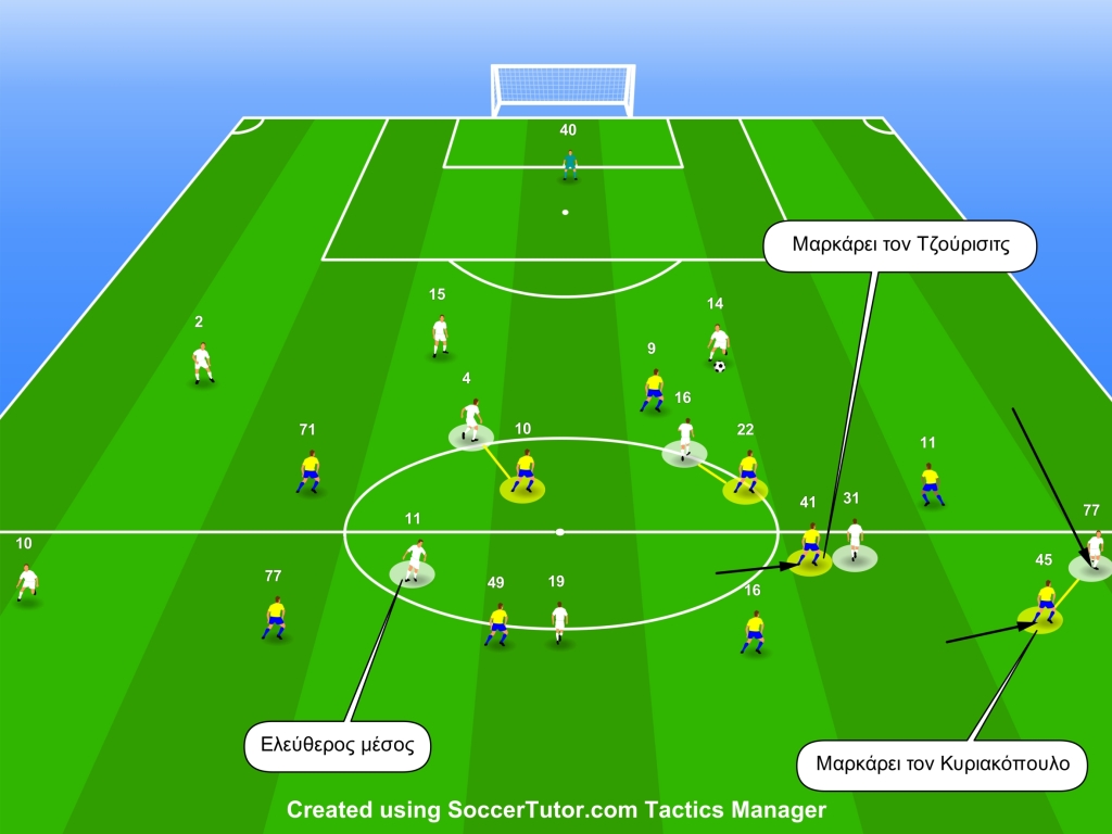 Όταν όμως ο αριστερός μπακ του ΠΑΟ ανέβαινε ψηλότερα, ο Γαλιάτσος άφηνε τον Τζούρισιτς για να μαρκάρει τον Κυριακόπουλο ενώ τον Τζουρισιτς αναλάμβανε ο Μπουχαλακης.