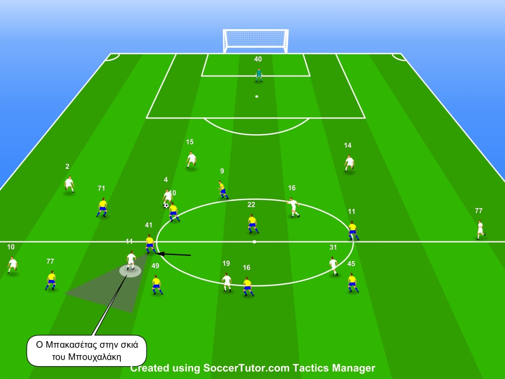 Όταν η μπάλα παίζονταν στην αριστερή πλευρά και κοντά στην πλάγια γραμμή ο Μπουχαλάκης μάρκαρε τον Μπακασέτα ενώ όταν η μπάλα ήταν σε πιο κεντρική θέση στην ίδια πλευρά και ο Μπακασέτας ήταν σε πιο προωθημένη θέση, τοποθετούνταν μπροστά από τον αρχηγό του ΠΑΟ ώστε να τον βάζει στην σκιά του και να αποτρέπει τις άμεσες πάσες σ’ αυτόν