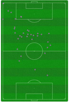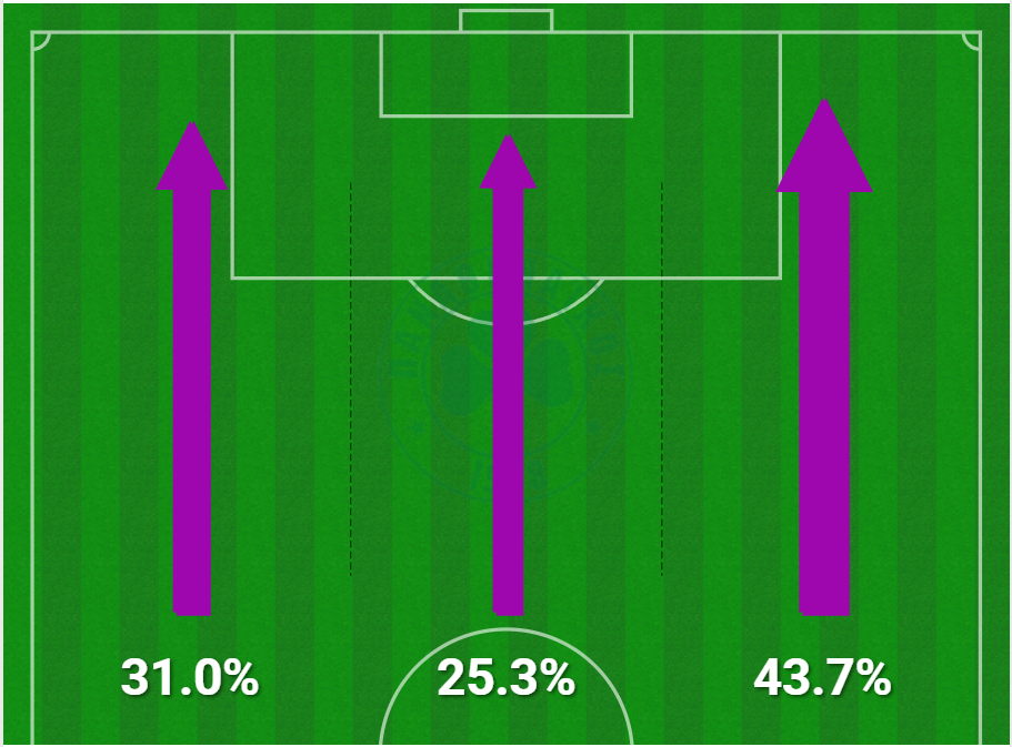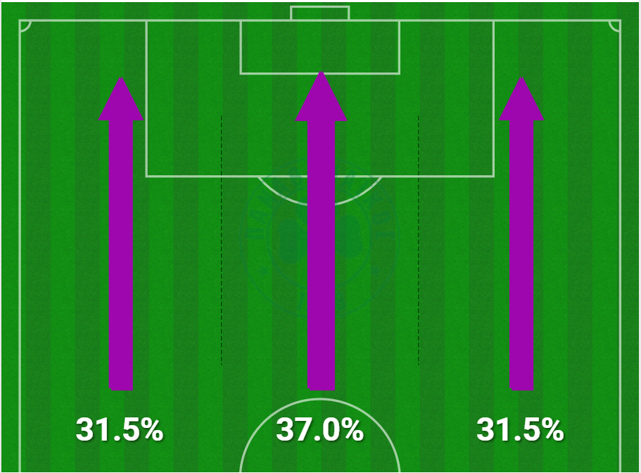 Παράλληλα αυξήθηκε πολύ το ποσοστό εκδήλωσης επιθέσεων από τον κεντρικό άξονα με το ποσοστό από το 17% που ήταν στα πρώτα 10 λεπτά του 2ου ημιχρόνου να εκτοξέυεται στο 37% από το 55’ και μετά.