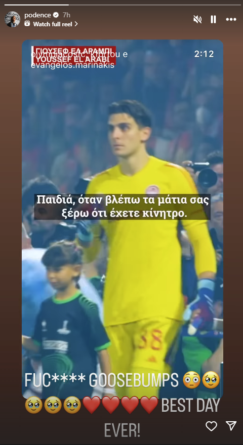 Ο Ποντένσε έκανε repost το συγκινητικό βίντεο που δημοσίευσε η ΠΑΕ Ολυμπιακός με τις ομιλίες των παικτών πριν τον τελικό, συνοδεύοντάς το με τη φράση: «Γα@@@@νη ανατριχίλα. Η καλύτερη μέρα από ποτέ».