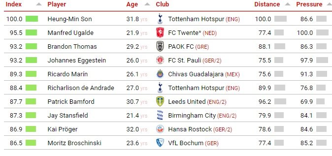 Σημειώνεται πως στην κατάταξη συμπεριλήφθηκαν μόνο ποδοσφαιριστές που έχουν παίξει τουλάχιστον 1.200 λεπτά στα εγχώρια πρωταθλήματα της τρέχουσας σεζόν.