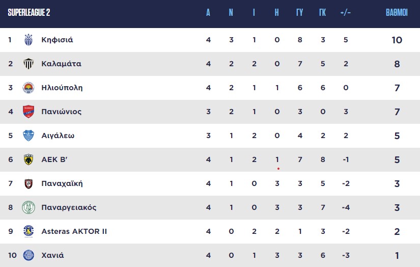 Μεγάλη κερδισμένη της 4ης αγωνιστικής στον Β’ Όμιλο της Super League 2 είναι η Κηφισιά, η οποία περιμένει την αναμέτρηση του Πανιωνίου με το Αιγάλεω (14/10, 16:30, monobala.gr) για να δει αν θα παραμείνει χωρίς συγκάτοικο στην κορυφή της βαθμολογίας.