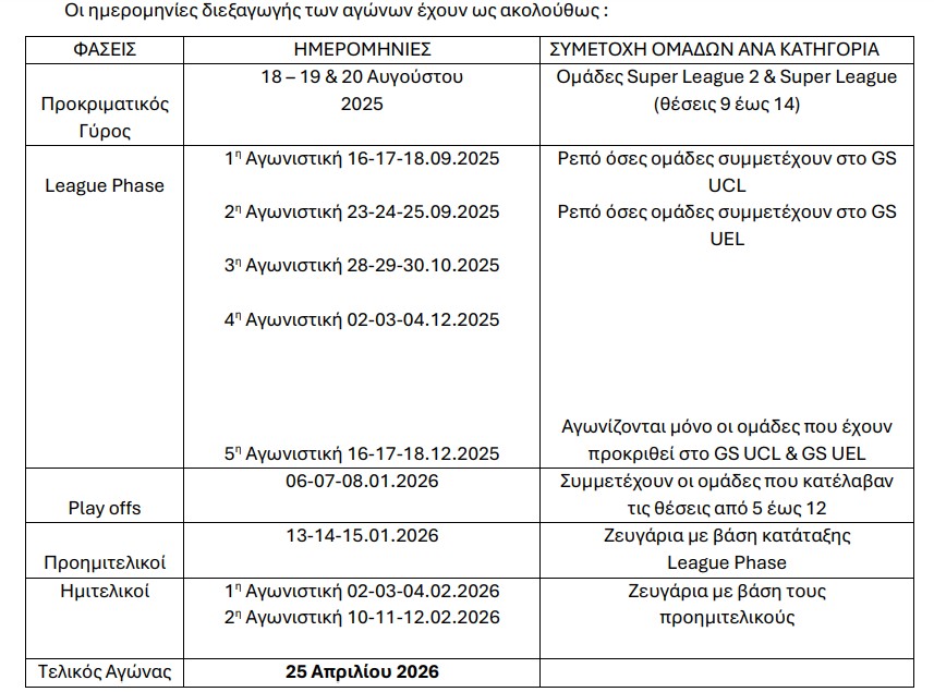 Aκολουθούν οι ημερομηνίες διεξαγωγής των αγώνων και το νέο φορμάτ της διοργάνωσης: